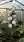 The plant rises from rich, dark loamy soil spotted with tiny insects on adjacent leaves and small clods of earth, a restrained greenhouse context with diffused panes and muted foliage providing complementary soft green and cool grey fields behind the subject.